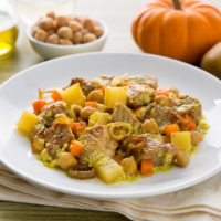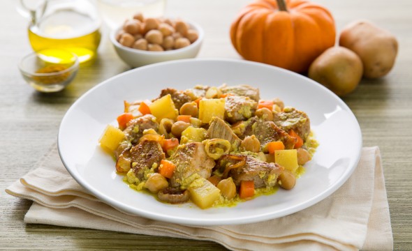 2Prendete una capiente casseruola antiaderente e rosolate a fuoco vivo per qualche minuto la carne con il porro tagliato a fettine, sfumate col vino bianco, poi aggiungete la zucca, le patate, i ceci, il curry e il contenuto di un dosatore di brodo granulare mescolando bene.